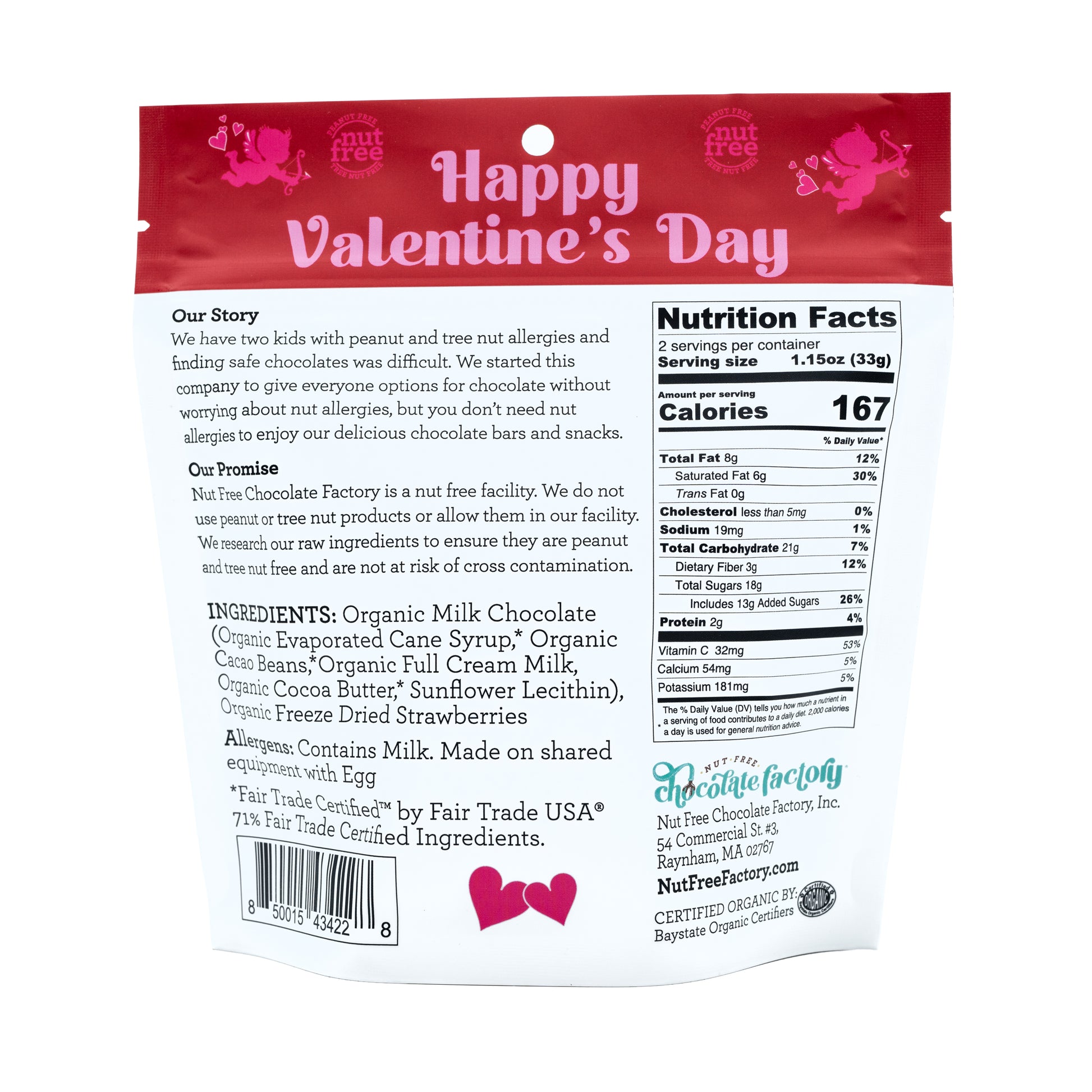 Organic, fair trade, peanut free, tree nut free. Freeze dried strawberries bursting with flavor and covered with velvety smooth milk chocolate. Packaged in a resealable stay-fresh bag (2.3 oz).